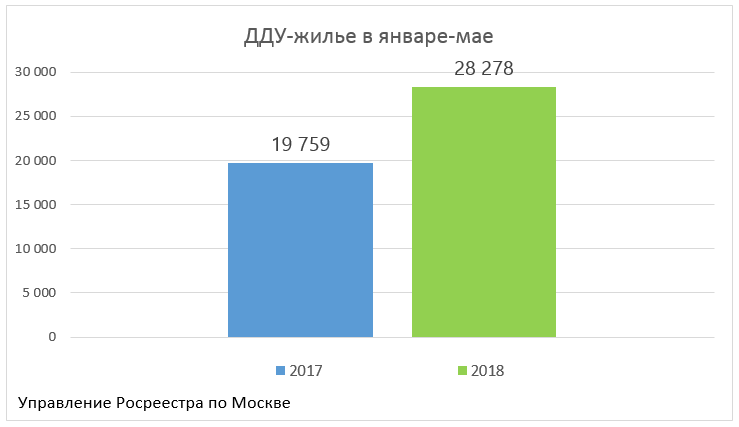 Несмотря на выходные праздничные дни в первой декаде мая, в течение месяца столичный рынок продемонстрировал незначительный рост по договорам долевого строительства на жилую недвижимость в сравнении с предшествующим апрелем. Так, в мае 2018 года Управлением Росреестра по Москве зарегистрированы 6 273 договора долевого участия (ДДУ) на жилье, что на 2% больше, чем месяцем ранее (6 105 ДДУ). Всего же с января по май 2018 года в столице зарегистрировано 28 278 ДДУ на жилую недвижимость. Рост к аналогичному периоду прошлого года (19 759 ДДУ) +43%.
