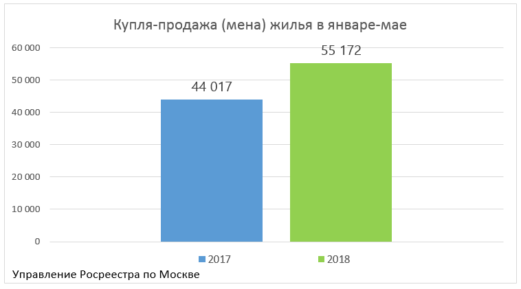 Более существенное влияние выходные дни оказали на вторичный рынок столичной недвижимости: в мае в Москве зарегистрировано 12 041 договор купли-продажи (мены) жилья, что на 7% меньше, чем в апреле 2018 года (12 971). При этом статистика 5 месяцев снова свидетельствует о растущей активности этого рынка на уровне +25%: 55 172 договора в январе-мае 2018 года против 44 017 договоров за аналогичный период прошлого года.