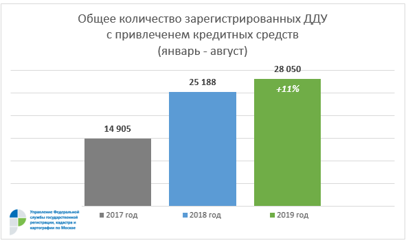 В частности, Мария Макарова рассказала, что с января по август 2019 года столичным Росреестром зарегистрировано более 73 тыс. договоров долевого участия, включая жилье и нежилье, – из них почти 40% (28 050 ДДУ) оформлено с применением кредитных средств. В сравнении с аналогичным периодом прошлого года (25 188 ДДУ) показатель увеличился на 11%. При этом еще двумя годами ранее в Москве за указанный период (14 905 ДДУ) зарегистрировано практически вдвое меньше договоров участия в долевом строительстве с привлечением кредитов.
